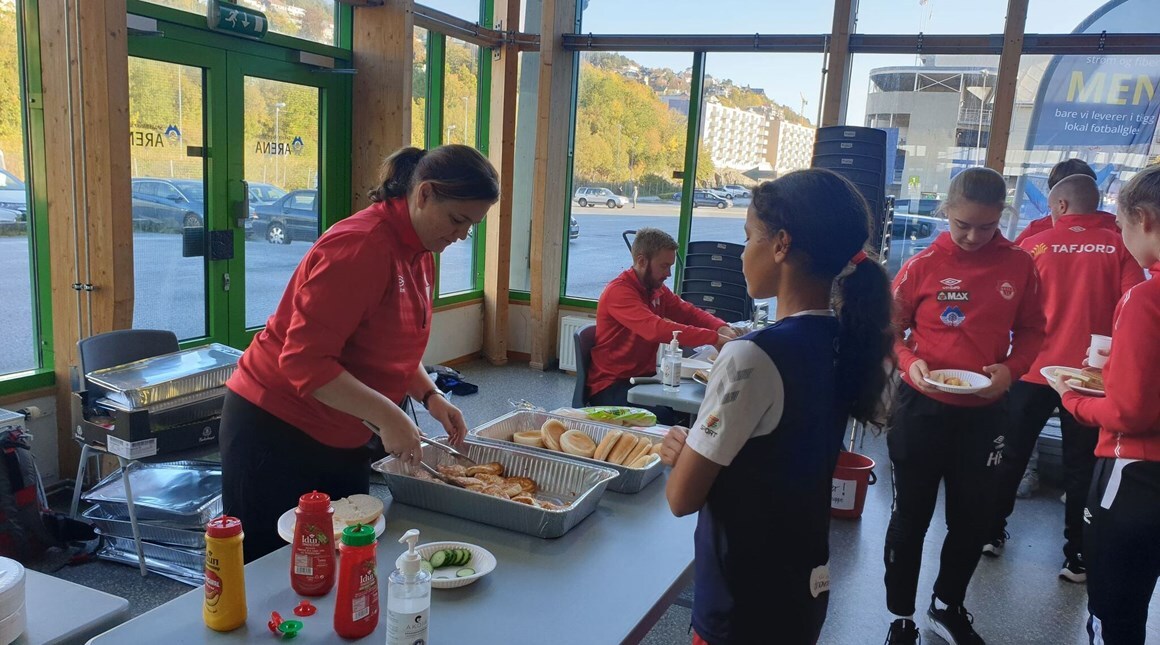 Da er guttene og jentene varme i trøya og har allerede blitt godt kjente. Slushmaskina er tom og konkurranseinstinktet på topp! I dag ble det servert Akslaburger fra Longvafisk til lunch som falt meget godt i smak.
