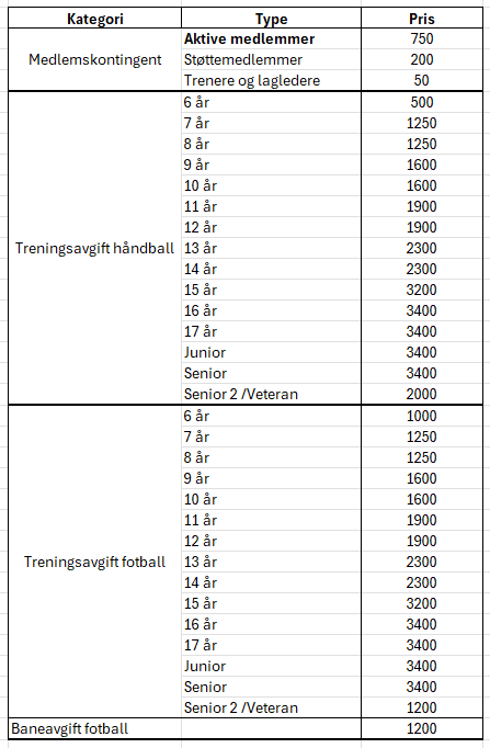 Treningsavgift for håndball er sesongbasert og følger håndballsesongen. Eks. fyller en spiller 10 år i 2025 så er treningsavgiften kr 1.500, fordelt på en termin i 2025 og en termin i 2026.